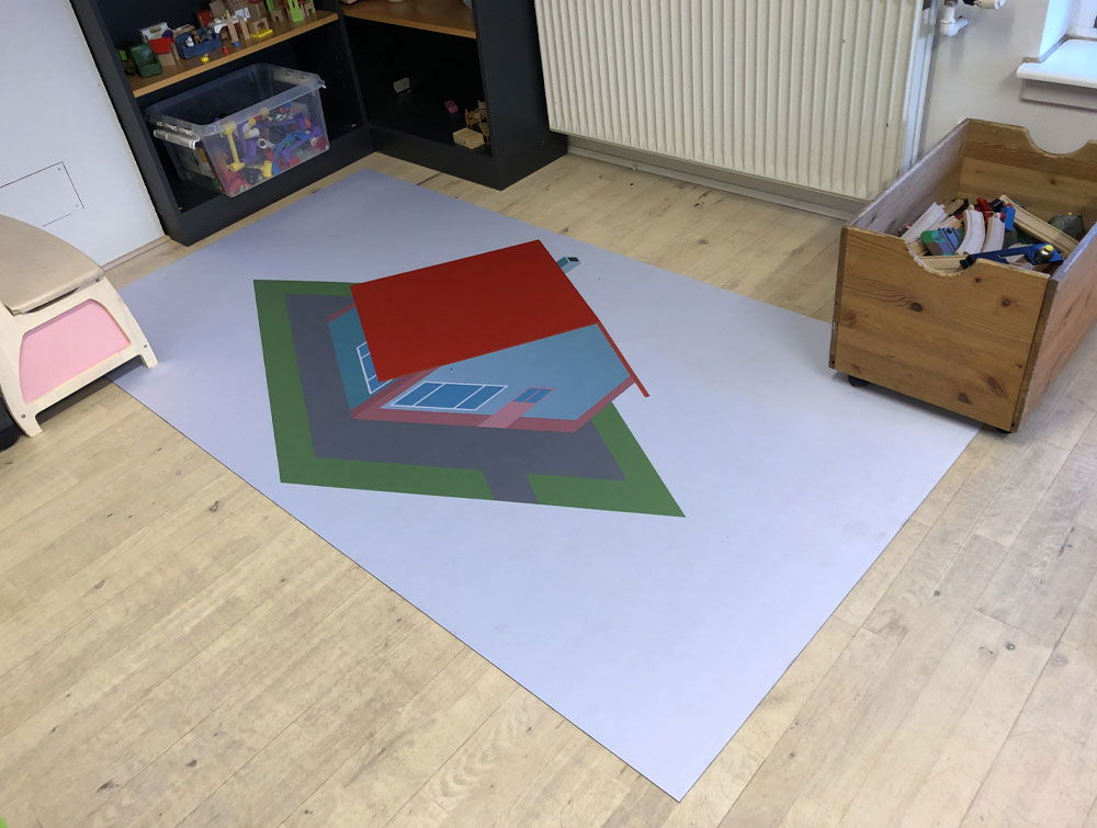 Til gulvet har vi leveret to måtter, som skaber zoner og et bedre fundament for leg i mindre grupper. Den ene måtte er her fremstillet af vinylgulv, hvilket er et tyndt, men slagkraftigt skummateriale i meget høj kvalitet. Den anden måtte er en neoprenmåtte fremstillet med en bund af naturgummi og en blød overflade af polyestertekstil. Begge måtter er behagelige at sidde på og så har de den fordel, at materialet ikke folder, men lægger sig helt fladt.