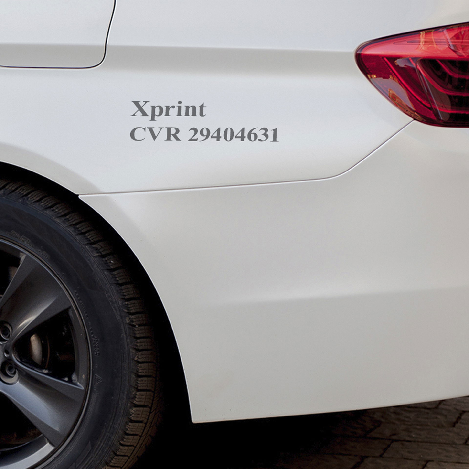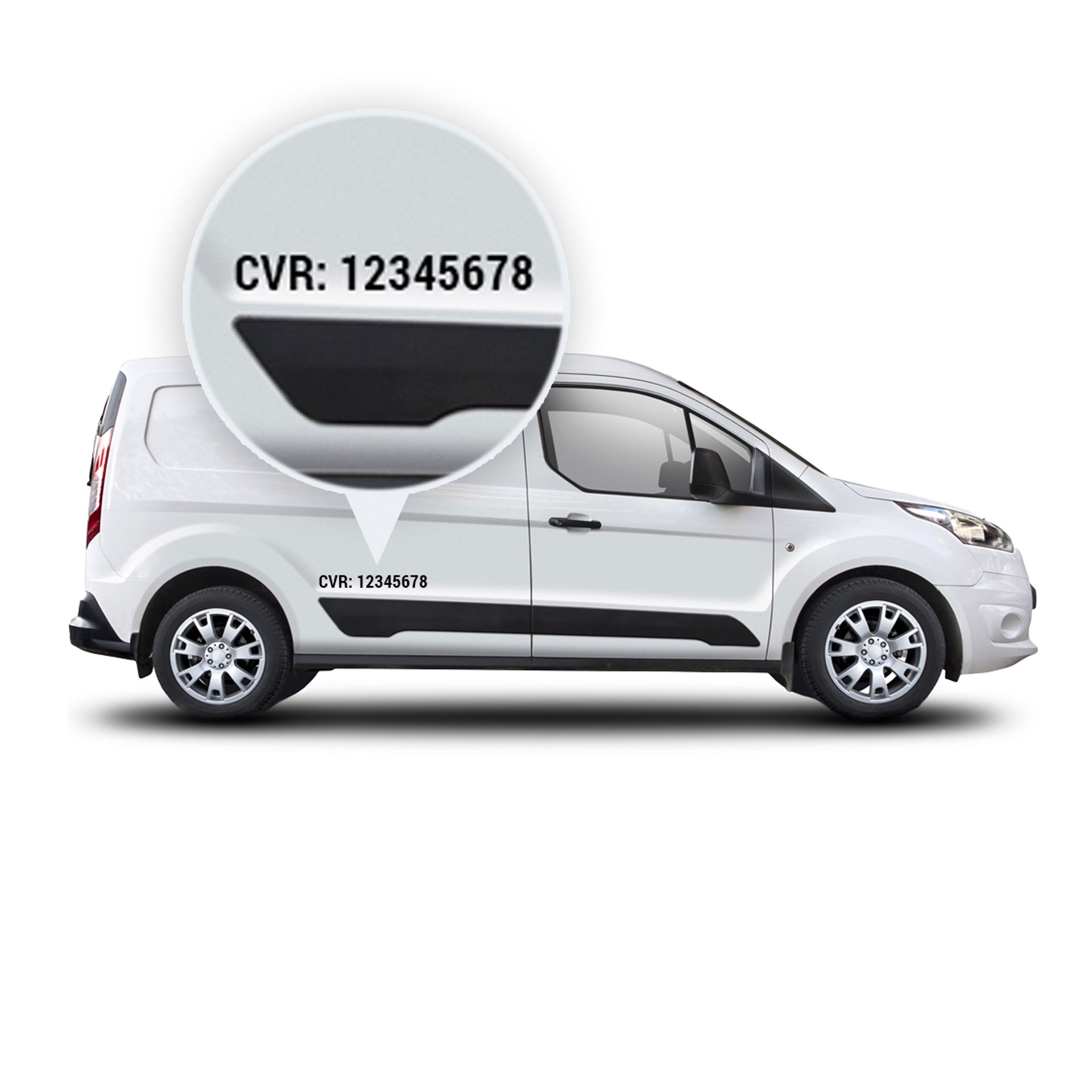 Her på siden kan du nemt og billigt få print af firmanavn og CVR til gulpladebiler. Du bestemmer selv, om du vil bestille navn og CVR nr. eller kun CVR nummeret til firma bil ved at klikke på fluebenet ud for "firmanavn".