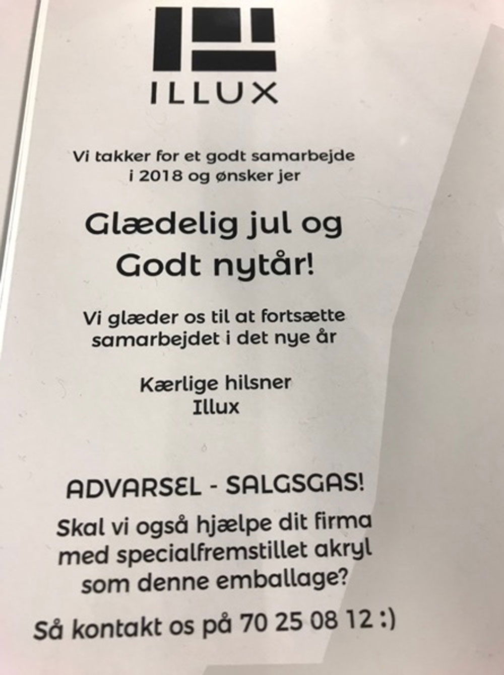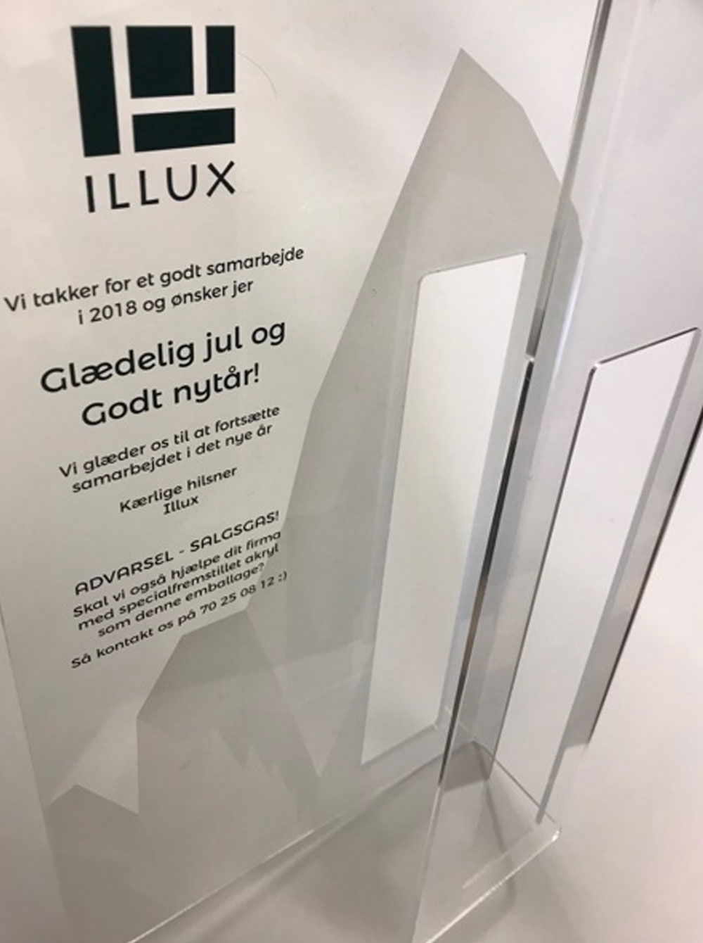 Den eksklusive flaskeholder er lavet til Illux A/S, og skulle bruges som julegave til deres kunder samt samarbejdspartnere. Det er en specialfremstillet flaskeholder som er fremstillet i 3 mm akryl, der først er udfræst i form, derefter printet på sort og hvidt print og til sidst bukket i vores plastbukker. På akrylen er der desuden printet en lille julehilsen fra Illux. Holderen til spiritusflasker får sit eksklusive look ved hjælp af dens unikke form og valg af materiale.