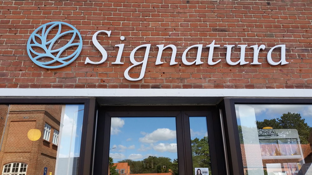Facadelogoet svæver 16 mm fra væggen ved et lille skilt og 25 mm ved et stort skilt.