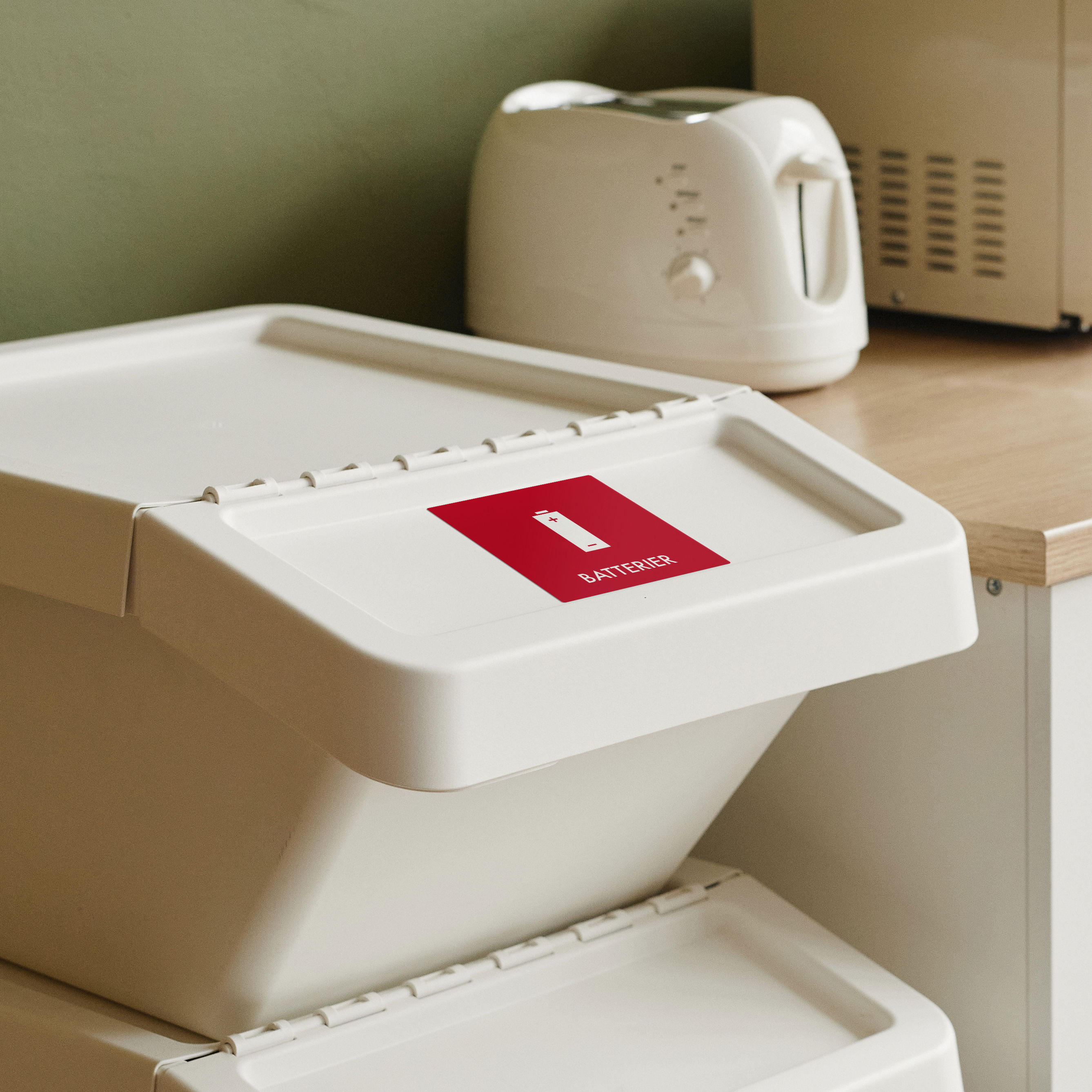 Dette klistermærke til affaldssortering bruges til at vise overfor medarbejdere og kollegaer, hvilken beholder batterier skal i.