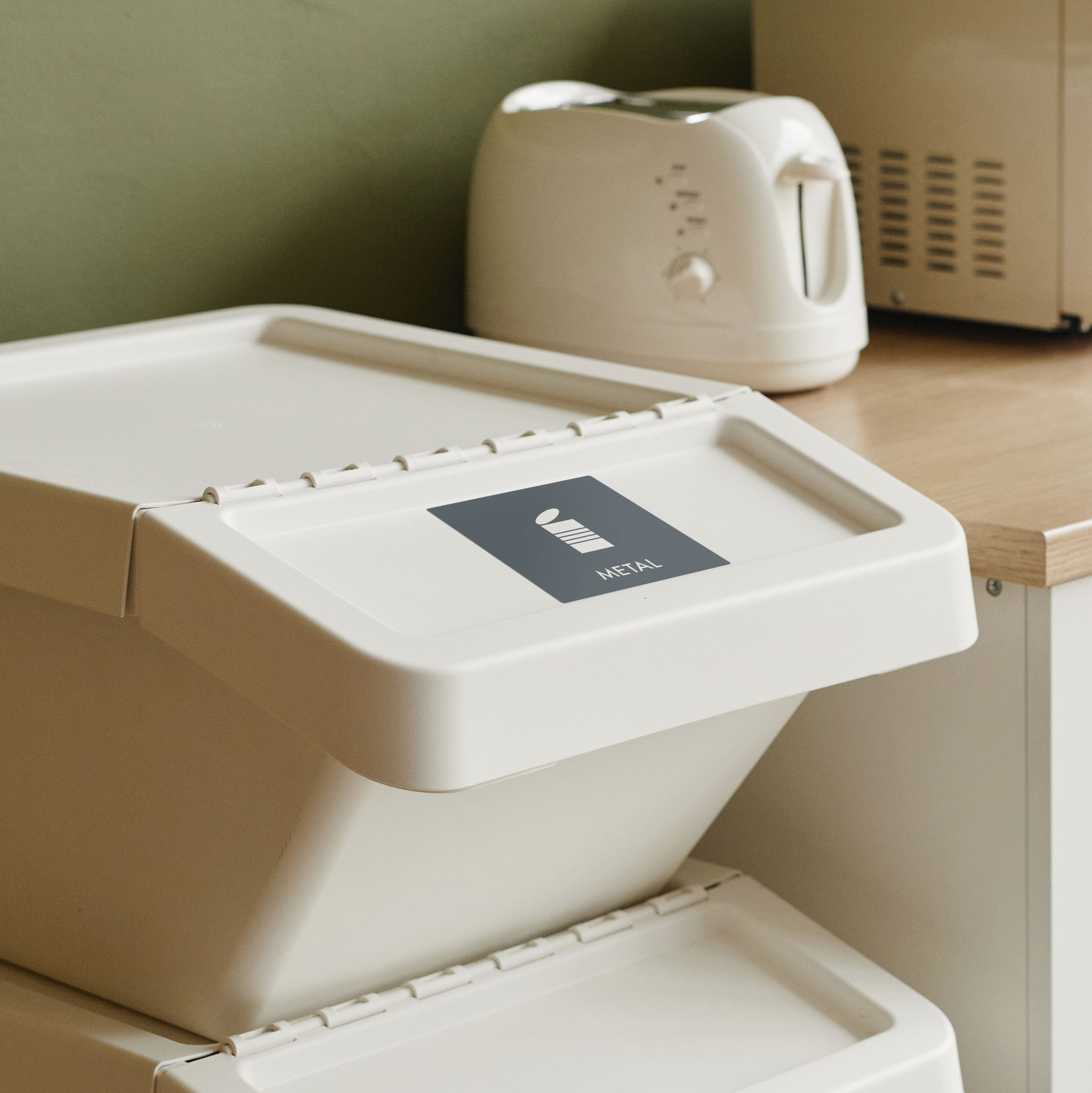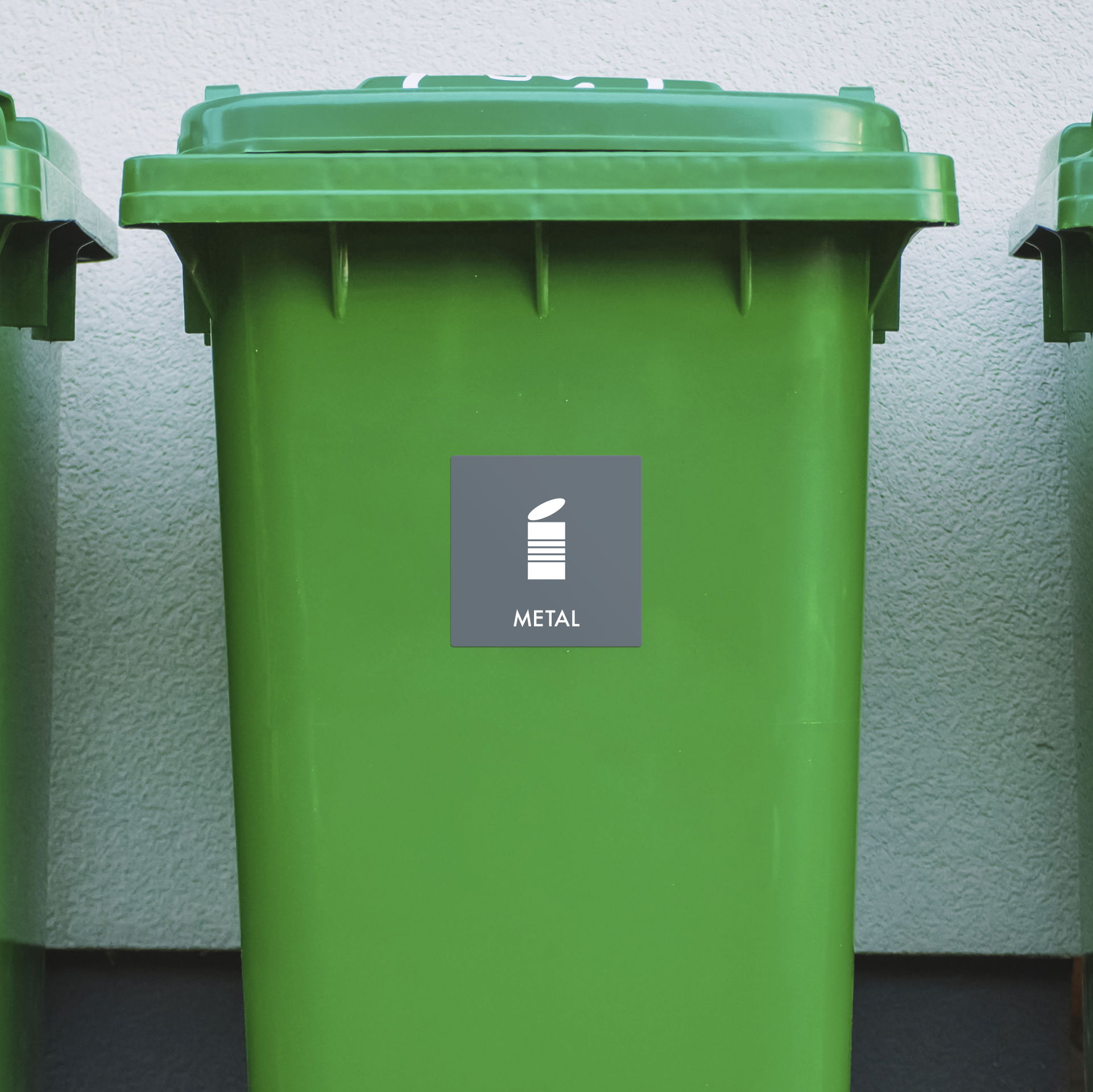 Dette klistermærke til affaldssortering bruges til at vise overfor medarbejdere og kollegaer, hvilken beholder metal skal i.
