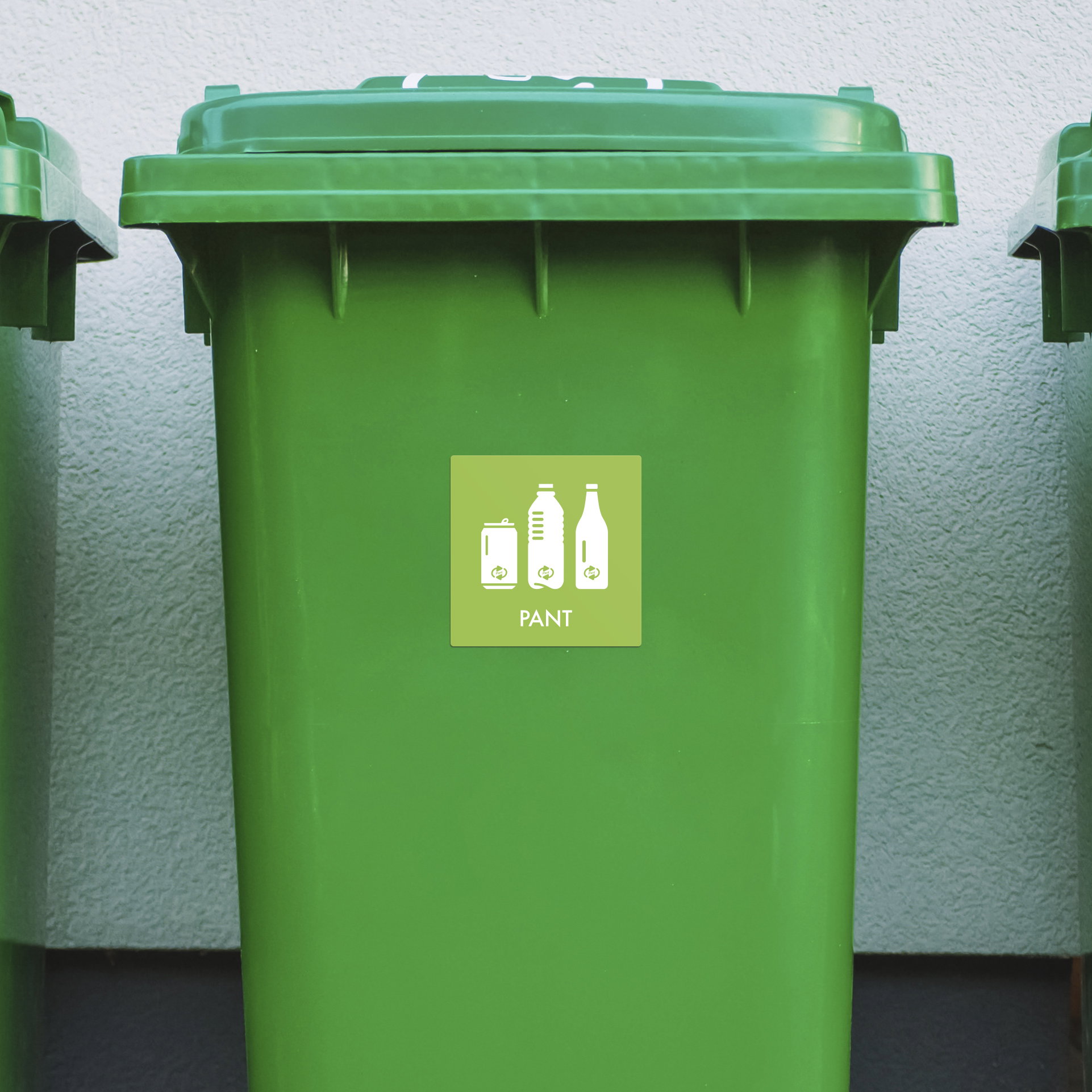 Dette klistermærke til affaldssortering bruges til at vise overfor medarbejdere og kollegaer, i hvilken beholder flasker og dåser med pant skal i.