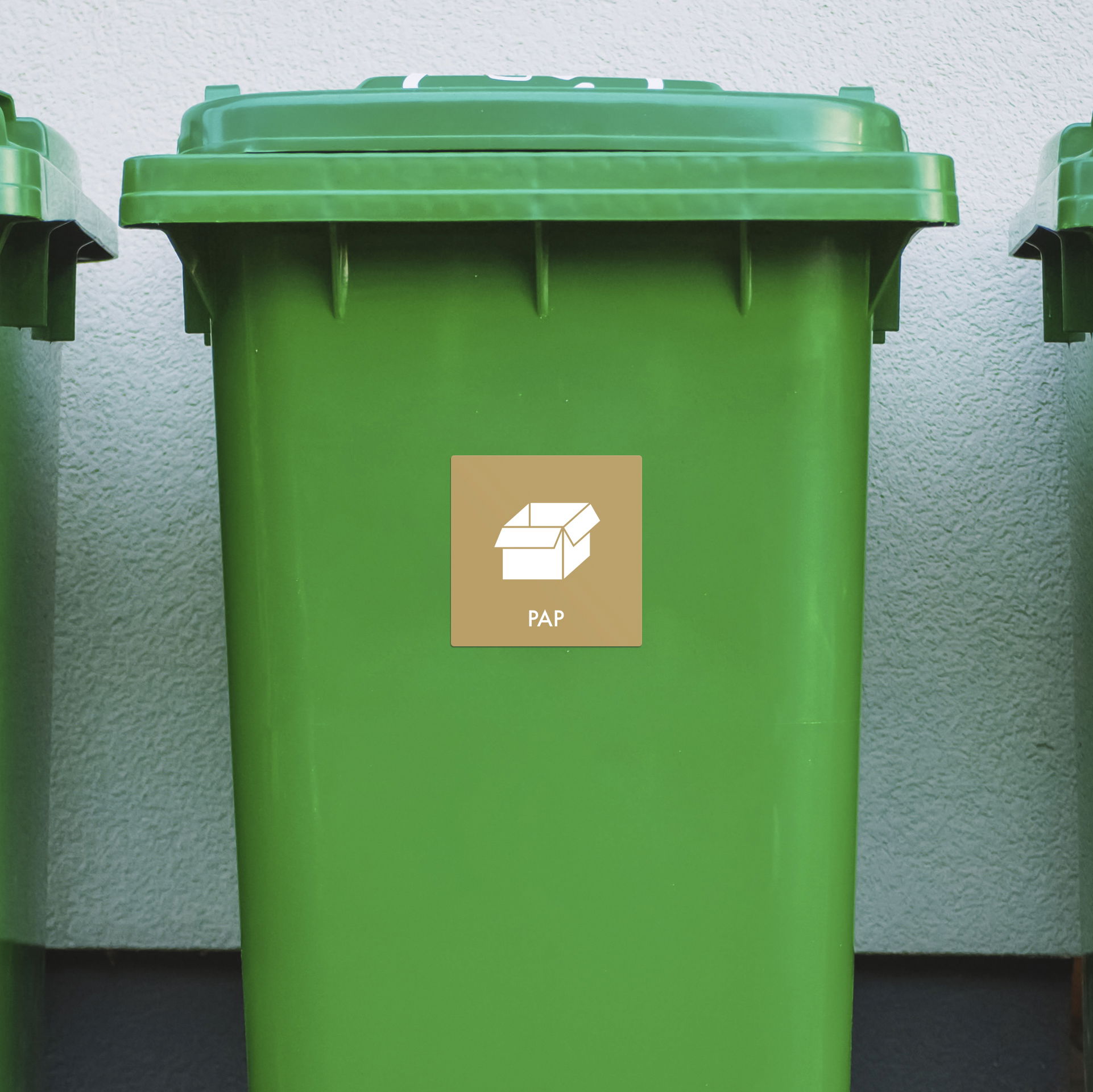 Dette klistermærke til affaldssortering bruges til at vise overfor medarbejdere og kollegaer, hvilken beholder pap skal i.