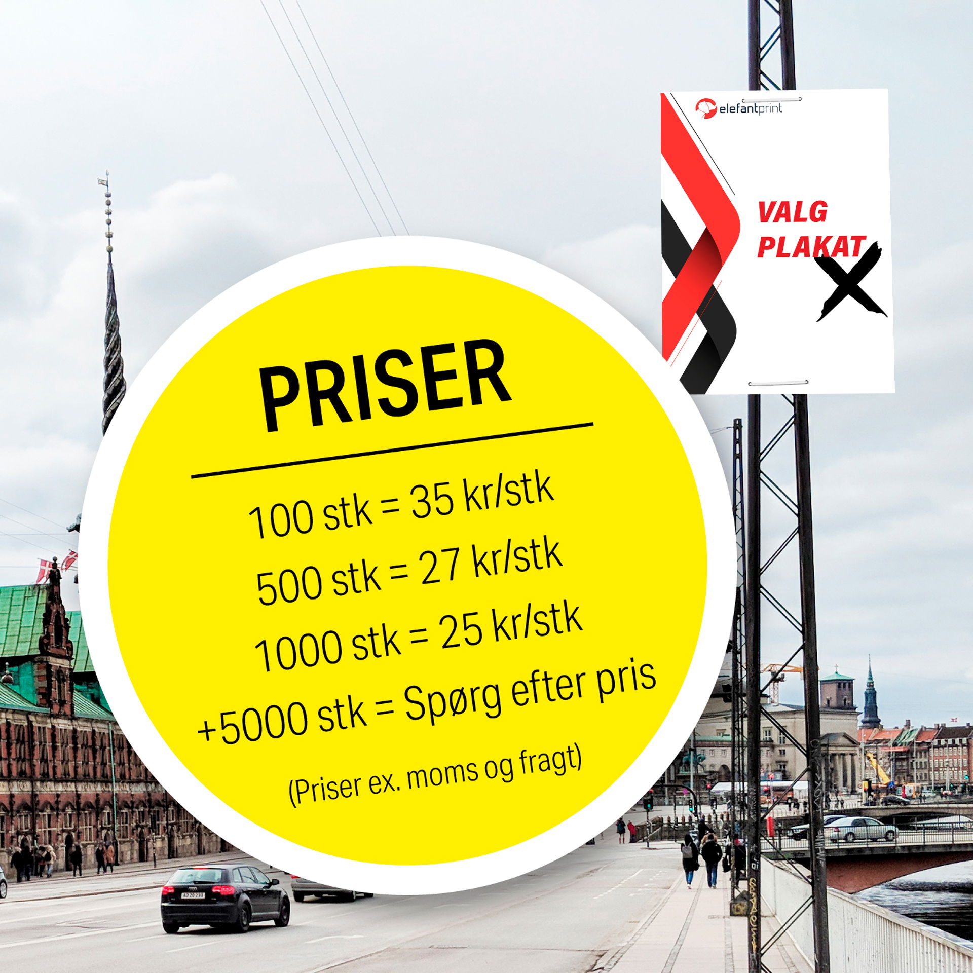 Jo flere valgplakater du bestiller, jo mere sparer du per plakat. Har du spørgsmål til produktet eller til levering, er du altid velkommen til at kontakte os til en uformel snak.